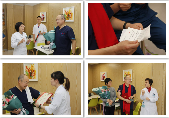 李娟主任致開場詞并為張先生送上了鮮花及瑞華心康CEO陸繼恩及多名醫(yī)務人員用心書寫的賀卡;康復師張萌向他頒發(fā)了“心臟康復達人”的證書;康復師陳漢送上代表達人的紅圍巾;白雪醫(yī)生朗讀了感人的祝賀詞,張?zhí)m院長深情的感謝張先生和家屬對中心的信任與支持,他們的行動深深的鼓舞著瑞華心康人在心臟康復道路上一路前行。