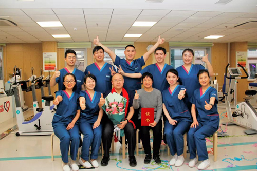 2019年1月8日下午四點半,張先生如往常一般進行完自己常規(guī)的心臟康復有氧運動訓練,中心精心組織安排的慶賀快閃活動開始了,20多位醫(yī)護康人員在音樂和掌聲下,為張先生舉行了溫馨的慶祝儀式。