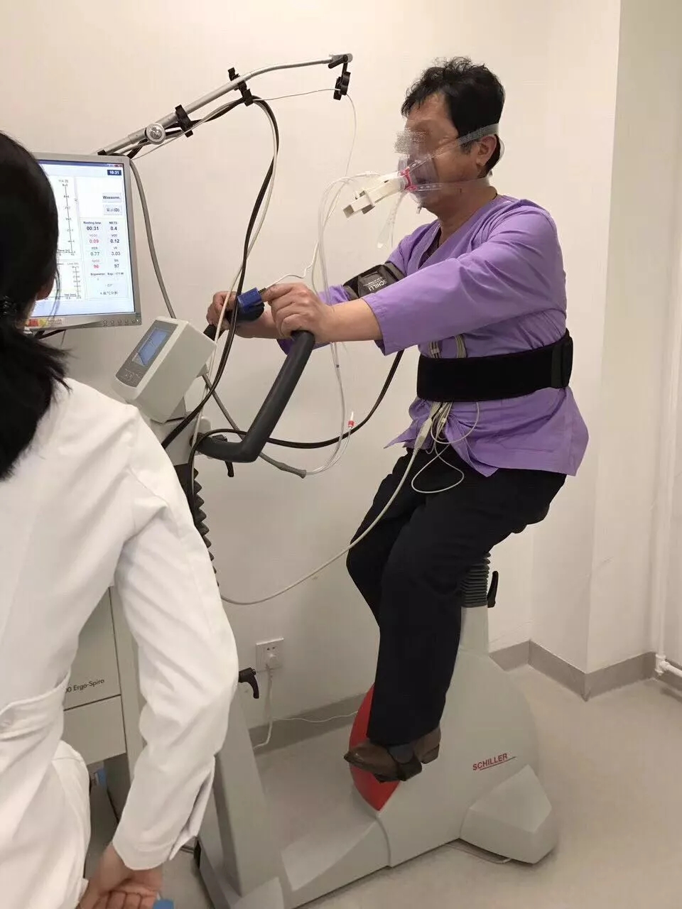 患者在醫(yī)生的指導(dǎo)下進(jìn)行心肺運(yùn)動(dòng)試驗(yàn)