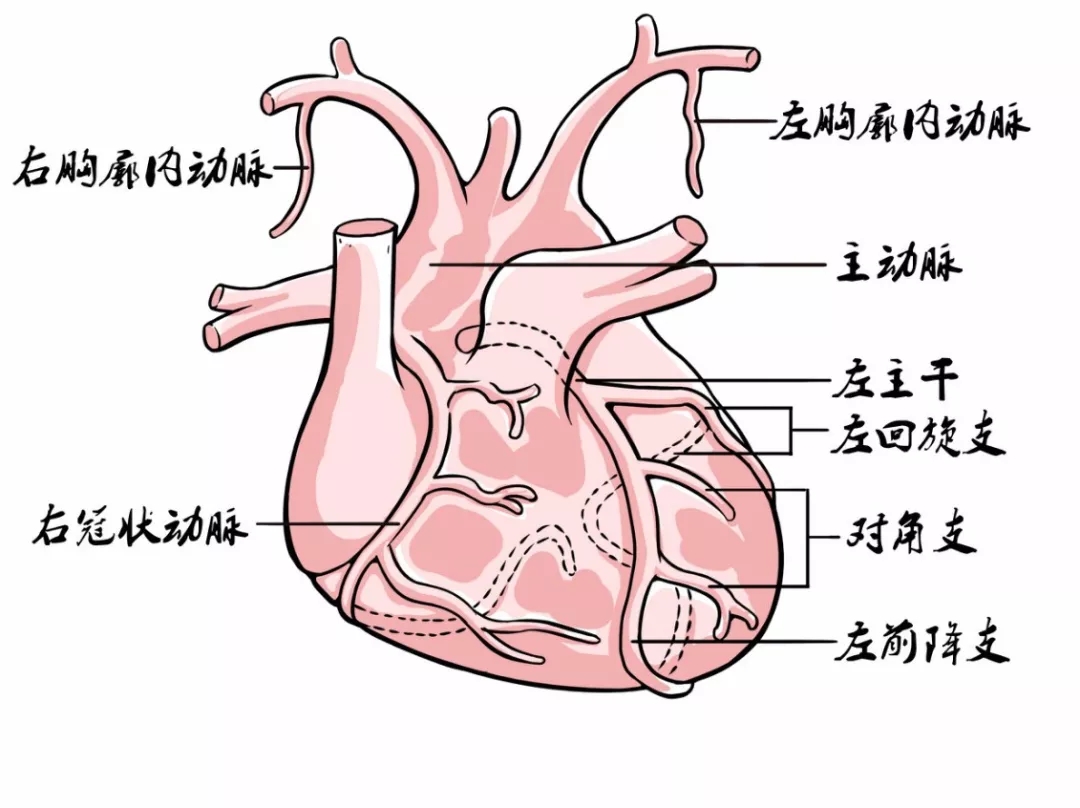 冠狀動脈分布于心臟表面,分為“左冠狀動脈”和“右冠狀動脈”兩支,左冠狀動脈再分為前降支及回旋支。