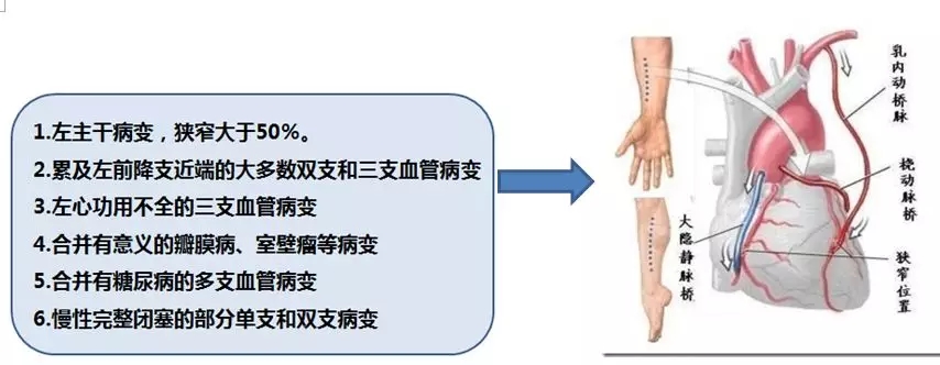 下圖列出了搭橋手術的適應癥,并標明了三種橋血管,分別是指把手上、腿上或肩膀部位的血管,移植到心臟上。